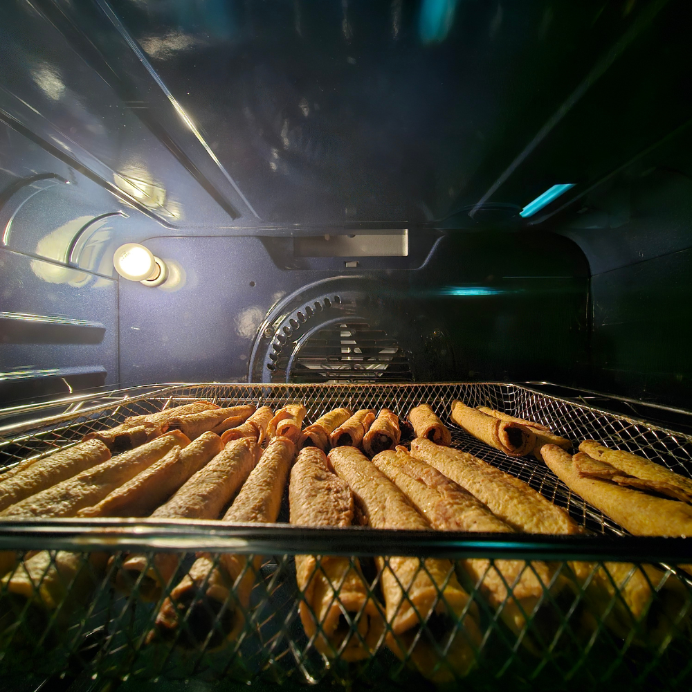 - Función de freidora de aire permite cocinar alimentos de manera rápida y más saludable evitando el uso de hasta 90% de aceite contra hornos tradicionales, además de ahorrar tiempo de cocción.